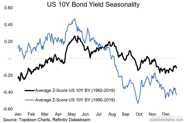 再往下看,更有意思的是,美元和美国国债收益率也呈现出明显的季节性趋势,债券收益率从6月到11月往往会下降。
