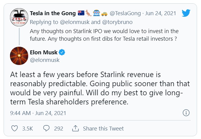 智通财经APP获悉,当地时间周三,特斯拉(TSLA.US)创始人马斯克表示,在星链(Starlink)营收可以被合理预测的情况下,将把星链从SpaceX中分拆上市。“至少要几年之后,在星链营收无法合理预测之前都不会上市,上市太早会很容易陷入痛苦。”马斯克在推文中表示,“将尽可能给予特斯拉长期股东优先权。”