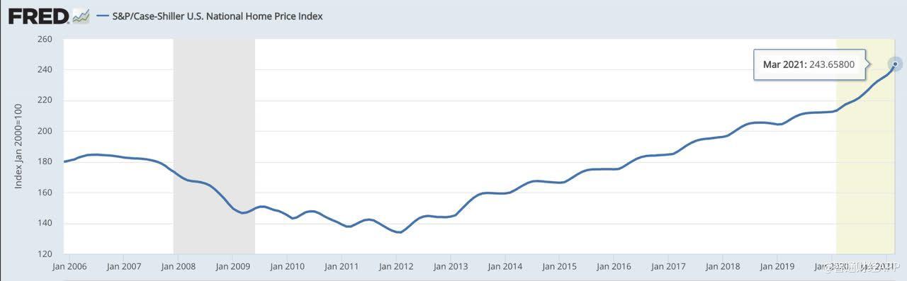 标普Case-Shiller全国房价指数是衡量美国住宅单户住房市场价值的变化,我们看到过去约15年以来,随着住房供应越来越紧俏,Case-Shiller指数每年都在上升,在住房短缺的今天,该指数继续达到新的水平。