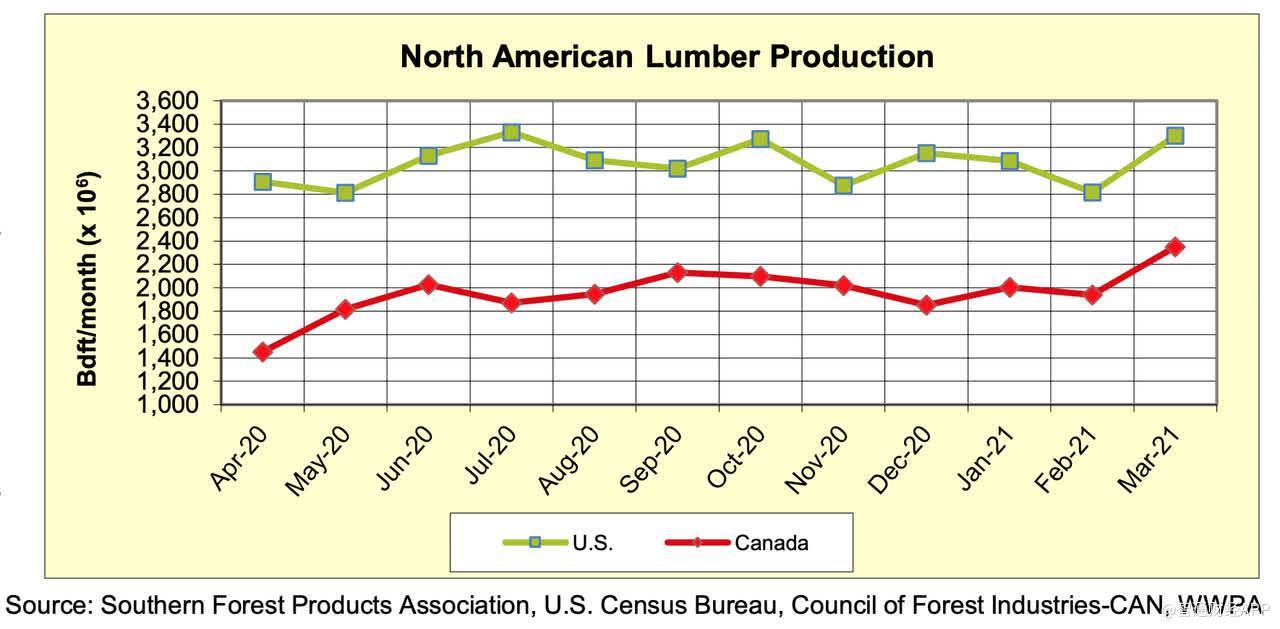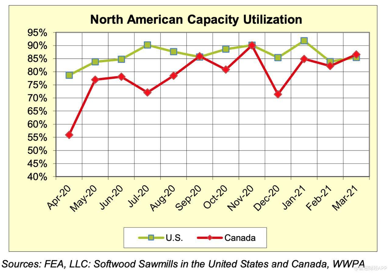 此外,行业数据显示,从2020年4月到2021年3月,美国锯木厂产能利用率从80%提高到85%,加拿大的产能利用率更是从55%提高到87%。同期,美国的木材产量增加了400立方英尺/月(106)或13.8%,加拿大的木材产量增加了900立方英尺/月(106)或62%。