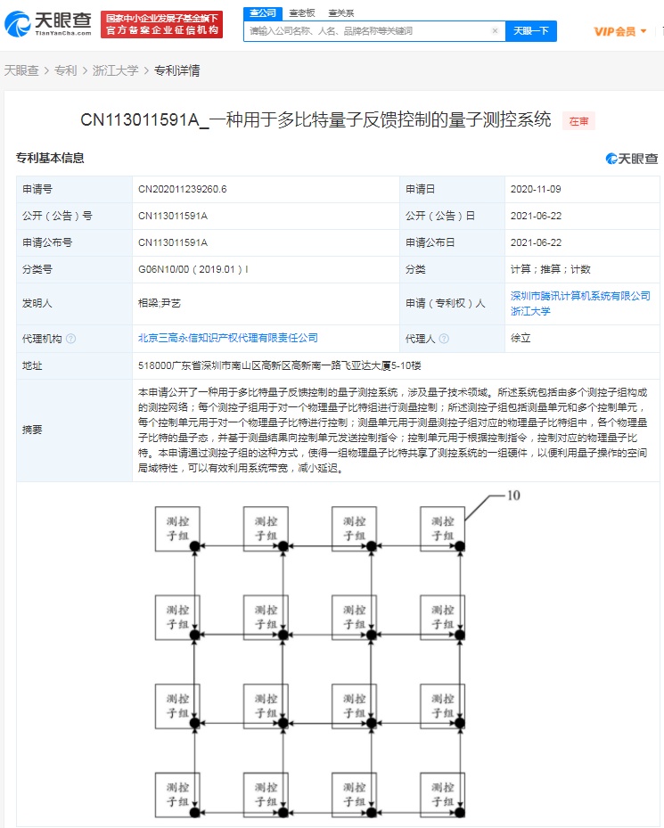 智通财经APP获悉,天眼查App显示,6月22日,深圳市腾讯计算机系统有限公司公开“一种用于多比特量子反馈控制的量子测控系统”专利,公开号为CN113011591A,申请日期为2020年11月。