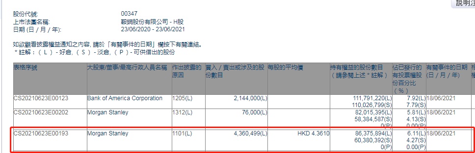 智通财经APP获悉,香港联交所最新资料显示,6月18日,摩根士丹利增持鞍钢股份(00347)约436.05万股,每股作价4.361港元,总金额约为1901.61万港元。增持后最新持股数目约为8637.59万股,最新持股比例为6.11%。
