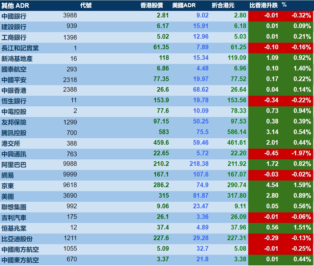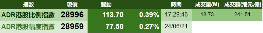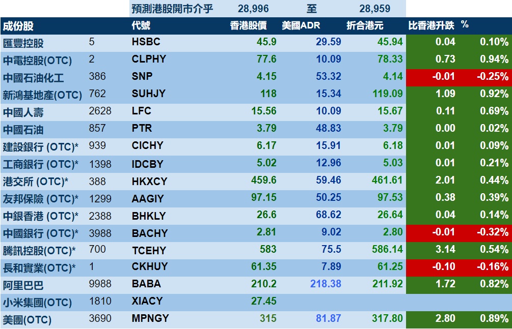 智通财经APP获悉,周四美股三大指数收涨,港股ADR指数上涨,按比例计算,收报28996点,涨113.70点或0.39%。