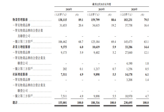 于往绩记录期间,公司自物业管理服务产生大部分收入,分别占公司2018年、2019年 和2020年总收入约89.1%、88.6%及79.5%。公司的非业主增值服务在2020年录得显著增长。 由于公司持续努力向非物业业主推广公司的增值服务,特别是公司的销售处管理服务,收入比例由2019年约5.9%增至2020年约14.4%。下表载列公司于所示期间按业务线及最终付款客户划分的收入明细: