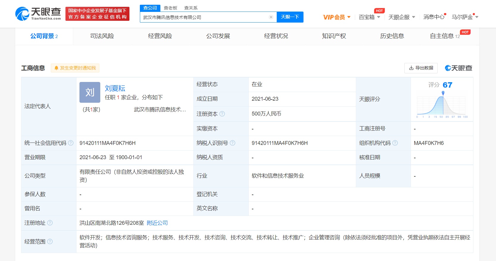 智通财经APP获悉,天眼查App显示,6月23日,武汉市腾讯信息技术有限公司成立,注册资本500万人民币,法定代表人刘夏耘。经营范围包括软件开发、信息技术咨询服务、企业管理咨询等。