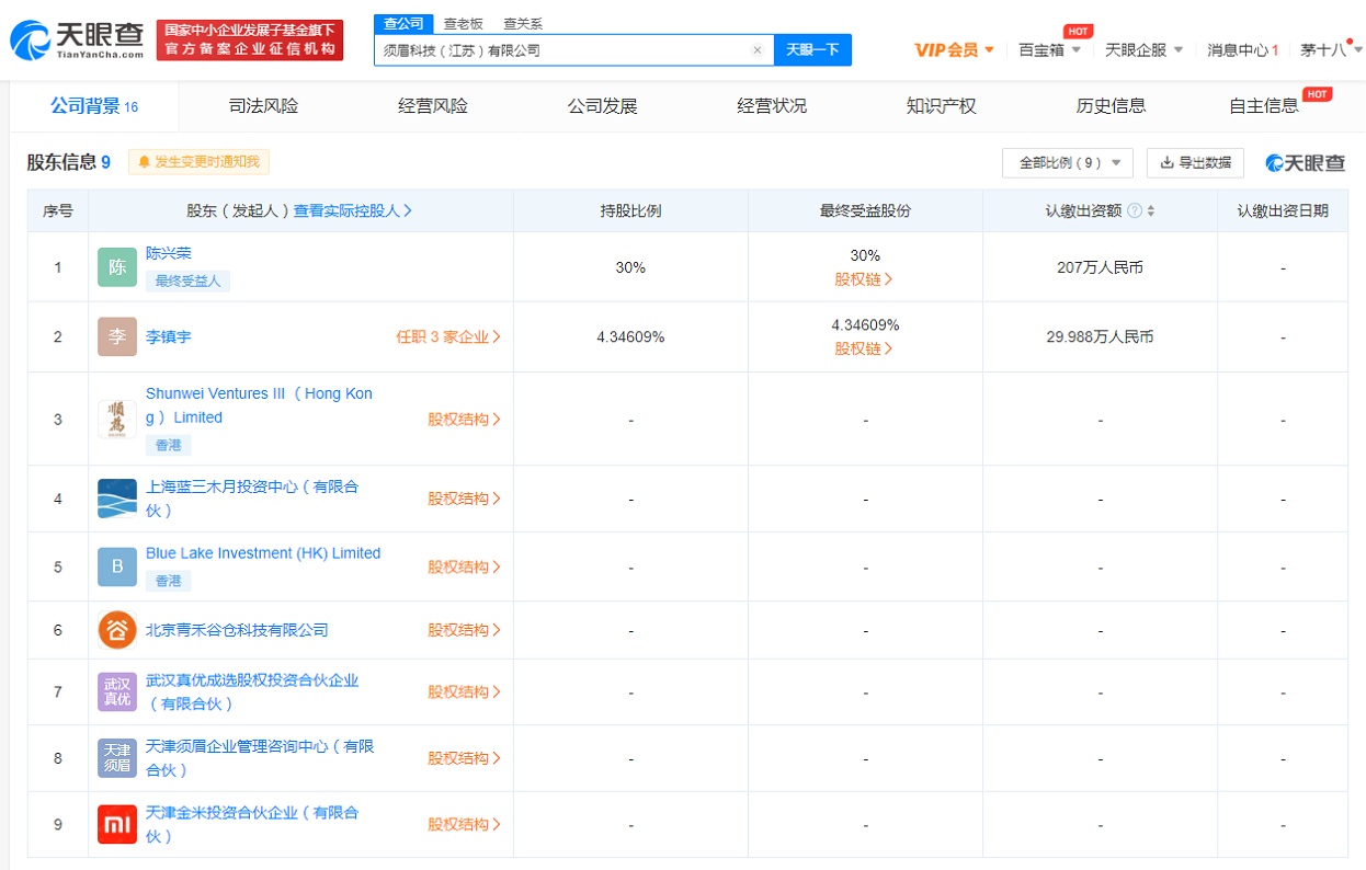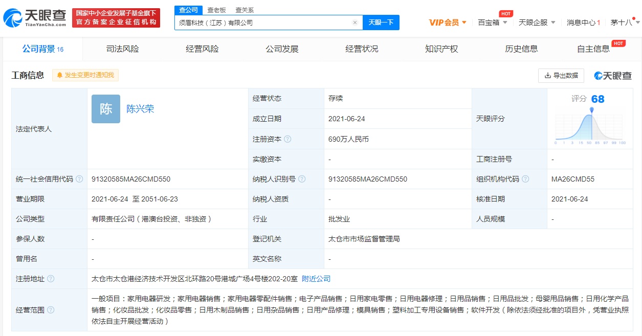智通财经APP获悉,天眼查App显示,6月24日,须眉科技(江苏)有限公司成立,注册资本690万人民币,法定代表人为陈兴荣,经营范围包括家用电器研发;电子产品销售;日用品销售等。股东信息显示,该公司股东包括陈兴荣、天津金米投资合伙企业(有限合伙)、Shunwei Ventures III (Hong Kong) Limited等。