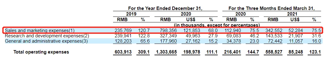 结合招股书披露的信息来看,2019年,该公司的销售和营销费用为2.36亿元,占总营收的比例为120.7%;2020年和2021年Q1的营销费用虽有所下降,但占比仍不低——同期营销费用分别为7.98亿元和3.43亿元,占同期营收的比例则为68%和76%。