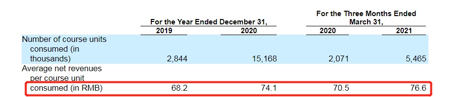 比如,提价。据了解,火花思维的在线小班课程平均每节课的收入逐步提升,已经从2019年的68.2元提升至2020年的74.1元,再到2021年一季度达到76.6元。
