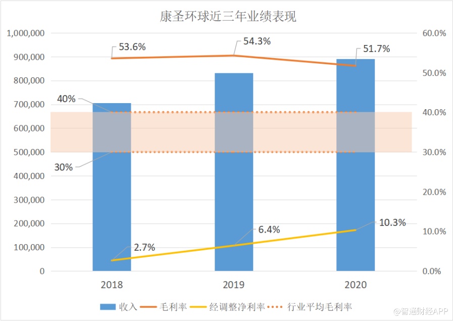 据智通财经APP了解到,2018至2020年,康圣环球分别实现收入7.06亿元、8.32亿元和8.91亿元。其中,毛利分别为3.78亿元、4.52亿元及4.61亿元,毛利率分别为53.6%、54.3%及51.7%;同期,康圣环球经调整利润分别达1885万、5333万、9197万元,经调整利润率分别为2.7%、6.4%、10.3%。