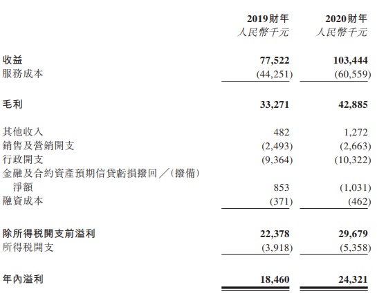 招股书显示,该公司2019财年至2020财年收益分别7752.2万元、1.03亿元;毛利分别为3327.1万元、4288.5万元,毛利率分别为42.9%、41.5%;净利润分别为1846万元、2432.1万元,净利率分别为23.8%、23.5%。