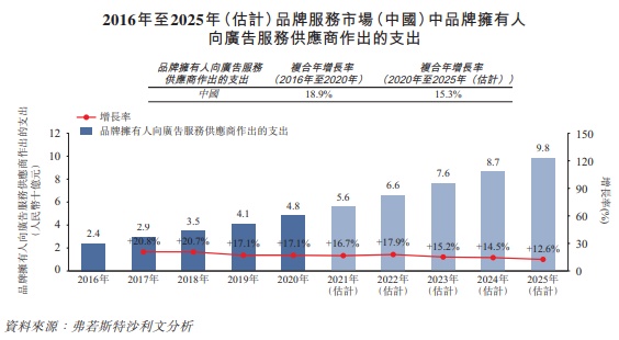 据弗若斯特沙利文资料,自2016年至2020年,中国品牌、广告及营销方案一体化服务市场总支出快速增长,由5355亿元增加至9734亿元,复合年增长率为16.1%。于2020年,湖北省品牌、广告及营销方案一体化服务总支出达到约246亿元,约占全国总支出的2.5%。未来,中国品牌、广告及营销方案一体化服务市场预期将保持快速增长,到2025年末,总支出将达到18475 亿元,2020年至2025年的复合年增长率将为13.7%。