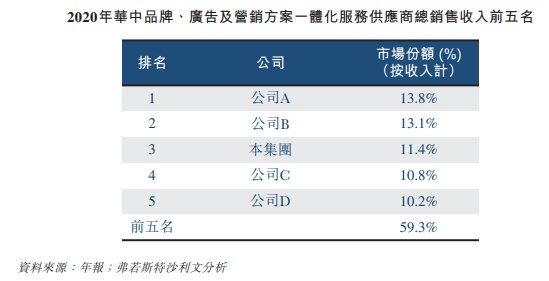其中,华中地区约有15家品牌、广告及营销方案一体化服务供应商,总销售收入约为9.068亿元。在华中所有品牌、广告及营销方案一体化服务供应商中,以2020年总销售收入计,本集团排名第三,市场份额为11.4%。于2020年,本集团的销售收入占中国品牌、广告及营销方案一体化服务总支出约0.01%。