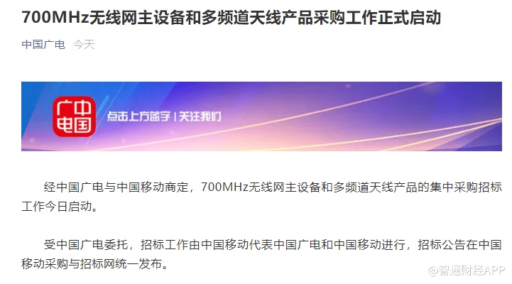 智通财经APP获悉,据中国广电官方微信公众号披露,经中国广电与中国移动(00941)商定,700MHz无线网主设备和多频道天线产品的集中采购招标工作今日启动。