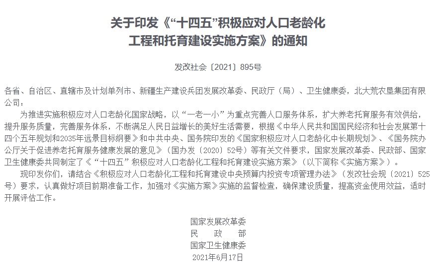“十四五”积极应对人口老龄化工程和托育建设实施方案