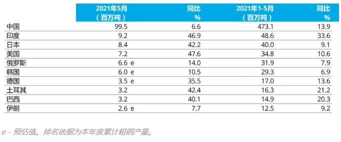 5月粗钢产量前三位的国家分别为中国、印度和日本,其中,中国粗钢产量为9950万吨,同比提高6.6%;印度粗钢产量为920万吨,同比提高46.9%;日本粗钢产量为840万吨,同比提高42.2%。