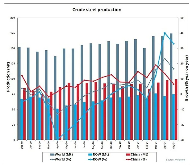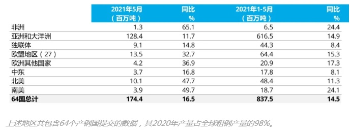 智通财经APP获悉,世界钢铁协会公布数据显示,2021年5月,全球64个纳入世界钢铁协会统计国家或地区的粗钢产量为1.744亿吨,同比提高16.5%。