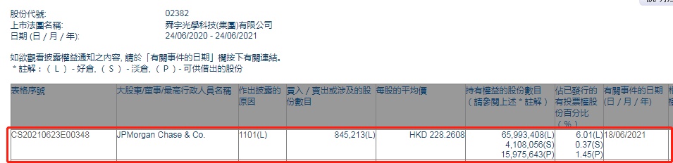 智通财经APP获悉,香港联交所最新资料显示,6月18日,摩根大通增持舜宇光学(02382)约84.52万股,每股作价228.2608港元,总金额约为1.93亿港元。增持后最新持股数目约为6599.34万股,最新持股比例为6.01%。