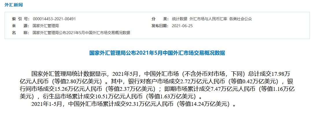 智通财经APP获悉,6月25日,国家外汇管理局公布2021年5月中国外汇市场交易概况数据。数据显示,2021年5月,中国外汇市场(不含外币对市场,下同)总计成交17.98万亿元人民币(等值2.80万亿美元)。其中,银行对客户市场成交2.72万亿元人民币(等值0.42万亿美元),银行间市场成交15.26万亿元人民币(等值2.37万亿美元);即期市场累计成交7.47万亿元人民币(等值1.16万亿美元),衍生品市场累计成交10.51万亿元人民币(等值1.63万亿美元)。2021年1-5月,中国外汇市场累计成交92.31万亿元人民币(等值14.24万亿美元)。
