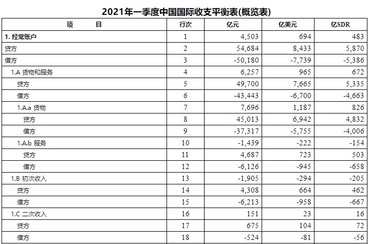 按美元计值,2021年一季度,中国经常账户顺差694亿美元,其中,货物贸易顺差1187亿美元,服务贸易逆差222亿美元,初次收入逆差294亿美元,二次收入顺差23亿美元。资本和金融账户逆差695亿美元,其中,资本账户逆差0.4亿美元,直接投资顺差757亿美元,证券投资顺差35亿美元,金融衍生工具顺差18亿美元,其他投资逆差1155亿美元,储备资产增加350亿美元。