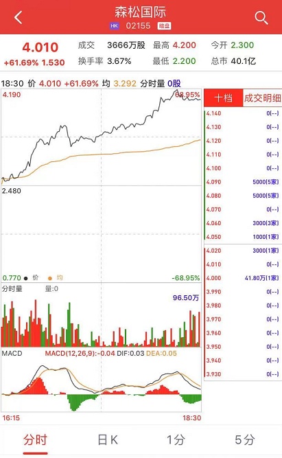 智通财经APP获悉,森松国际(02155)将于6月28日(星期一)在香港挂牌。截至暗盘收盘,利弗莫尔证券暗盘交易显示报价4.01港元,较招股价2.48港元涨61.69%。每手1000股,不计手续费,每手赚1530港元。