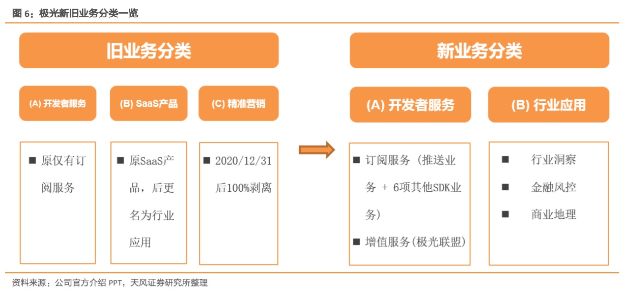 2020年中,由于广告行业的部分领域受到疫情冲击,极光加速将精准营销业务剥离。因此,进入2021年后,极光的全部业务便成为了SaaS业务。这其中又包括两部分,分别是开发者服务、行业应用。开发者服务在原有的订阅服务上添加了增值服务;而原来的SaaS产品则更名为行业应用服务。
