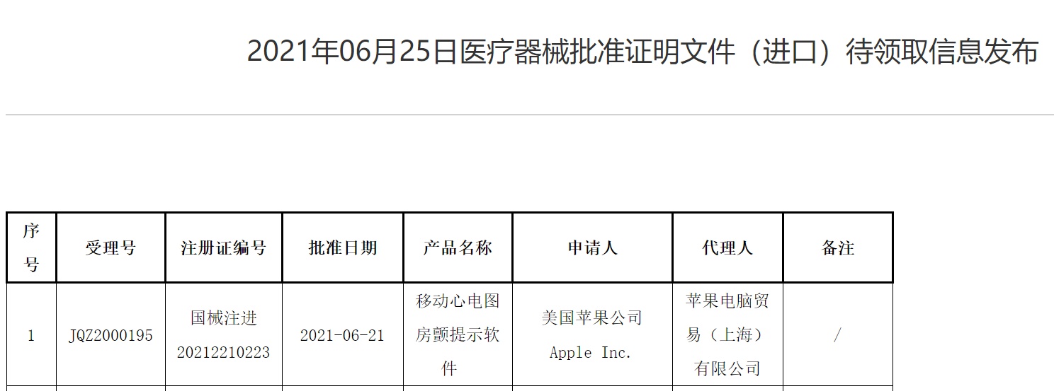 智通财经APP获悉,据国家药品监督管理局网站显示,6月25日医疗器械批准证明文件(进口)待领取信息,其中第一项是苹果公司(AAPL.US)的移动心电图房颤提示软件,注册证编号为国械注进20212210223。