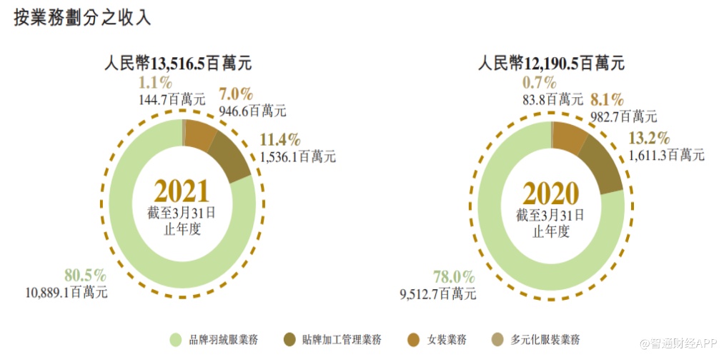 目前,波司登的业务涵盖品牌羽绒服、贴牌加工管理、女装及多元化服装,四大主营业务单元,其中品牌羽绒服业务为公司最大收入来源。2020/21财年,品牌羽绒服业务实现销售收入108.89亿元,同比上升14.5%,收入占比达到80.5%。其中,波司登主品牌收入同比上升18.9%,达99.98亿元。