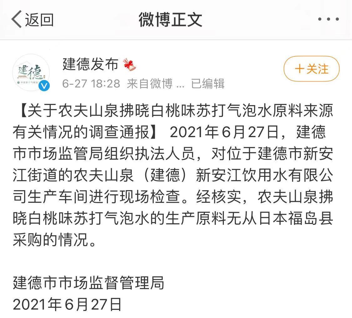 智通财经APP获悉,@建德发布 微博消息,建德市市场监督管理局通报称,2021年6月27日,建德市市场监管局组织执法人员,对位于建德市新安江街道的农夫山泉(建德)新安江饮用水有限公司生产车间进行现场检查。经核实,农夫山泉(09633)拂晓白桃味苏打气泡水的生产原料无从日本福岛县采购的情况。