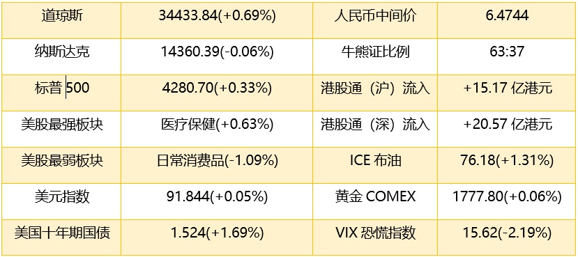 1、上周五美股道琼斯指数涨237.02点,涨幅0.69%,报34433.84点;纳斯达克综合指数跌9.32点,跌幅0.06%,报14360.39点;标普500指数涨14.21点,涨幅0.33%,报4280.7点。上周标普500指数屡创新高,该指数一周上涨2.7%,录得2月以来的最大周涨幅。道指上周上涨3.4%,纳指上周上涨2.4%。港股ADR指数上涨,按比例计算,收报29357点,涨69.26点或0.24%。