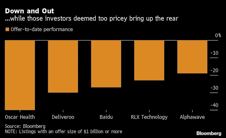 因此,今年许多备受瞩目的股票在上市交易中遭受打击。外卖初创公司Deliveroo Plc在伦敦上市首日股价暴跌26%,而乔什·库什纳(Josh Kushner)与他人共同创立的保险初创公司奥斯卡健康公司(OSCR.US)自在纽交所上市以来股价下跌了40%。