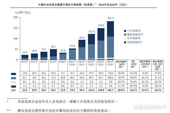 值得一提的是,2020年,国家提出海南自贸港的规划,离岛免税市场也成为重点发展方向,并且近年来迅速发展,市场规模从2016年的61 亿元增至2019年的135亿元,复合年增长率为30.5%。2022年将达到564亿元,到2025年有望达到1002亿元,2022年至2025年的复合年增长率为21.1%。