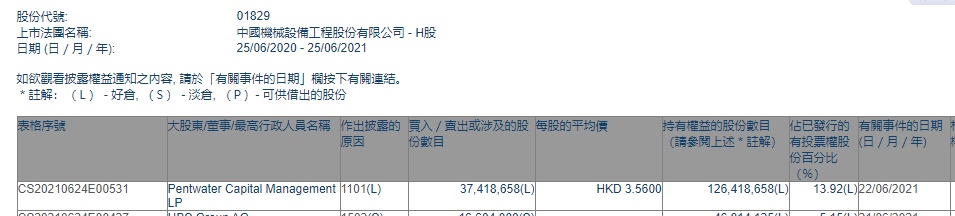 智通财经APP获悉,香港联交所最新资料显示,6月22日,Pentwater Capital Management LP增持中国机械工程(01829)3741.8658万股,每股作价3.56港元,总金额约为1.33亿港元。增持后最新持股数目约为1.264亿股,最新持股比例为13.92%。