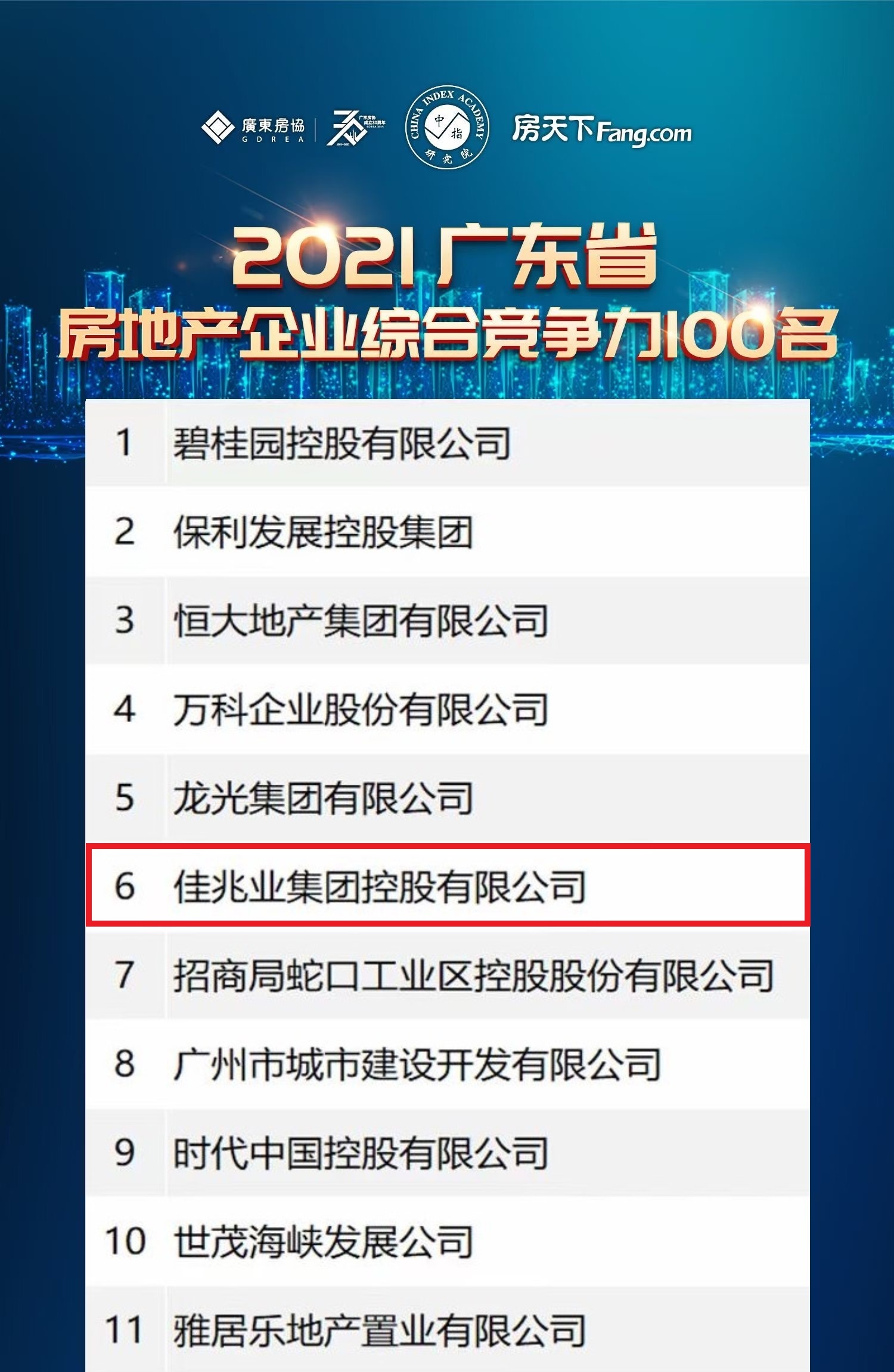 智通财经APP获悉,6月28日,由广东省房地产行业协会、中指研究院成立的广东省房地产企业综合竞争力研究课题组于线上发布《2021广东省房地产企业综合竞争力研究报告》,佳兆业集团(01638)前瞻布局粤港澳大湾区迎来战略收获期,位列2021广东房企综合竞争力100强第6名。
