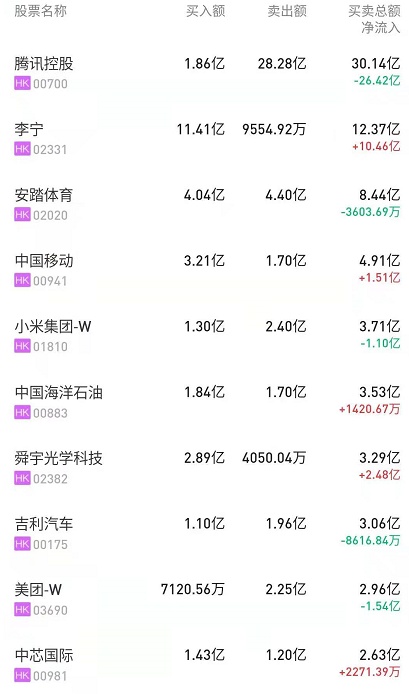 此外,舜宇光学(02382)、中移动(00941)分别获净买入2.48亿、1.5亿港元,而小米集团-W(01810)、中芯国际(00981)、腾讯(00700)分别遭净卖出6863万、8896万、26.32亿港元。