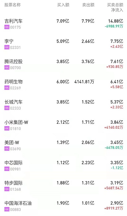 李宁(02331)获净买入12.88亿港元。消息面上,李宁发布盈喜,预期今年上半年净利不少于18亿元人民币,去年同期为6.83亿元,主要是由于收入增长超过60%以及经营利润率持续改善。多家大行发布研报唱好,富瑞维持李宁“买入”评级,目标价由56港元上调69.6%至95港元;大摩称,李宁有多项因素令盈利表现胜预期,包括强劲的需求、新策略、以及良好的盈利表现,预计至2023年净利润率可达18%;中信建投称,中长期来看,国潮消费已成为重要趋势,李宁作为中国运动服饰品牌的代表,有望享受时代红利。值得注意的是,同属体育用品股的特步国际(01368)获净买入5687万港元。