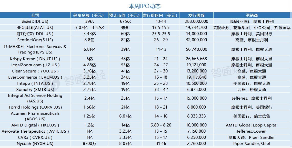 据智通财经APP不完全统计,本周美股共有18家公司即将IPO上市,募集资金达91亿美元,市场期待已久的网约车巨头滴滴(DIDI.US)本周将上市,计划筹集资金总额约40亿美元,最多筹资约46亿美元,预计市值达675亿美元。另外还有亚朵集团(ATAT.US)和叮咚买菜(DDL.US)等共计18只新股。