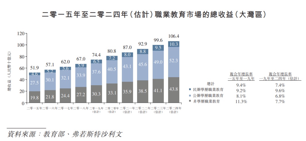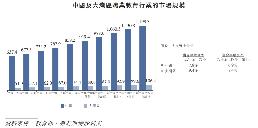 正是由于职业教育资源的匮乏与市场需求的高涨,大湾区的职业教育发展速度领跑全国。据弗若斯特沙利文数据显示,大湾区的职业教育行业规模在2015年至2019年的增长速度为9.4%,较全国平均水平7.8%高出1.6个百分点;其预计2019年至2024年大湾区的行业增速为7.4%,较同期全国平均水平的6.9%高出0.5个百分点。