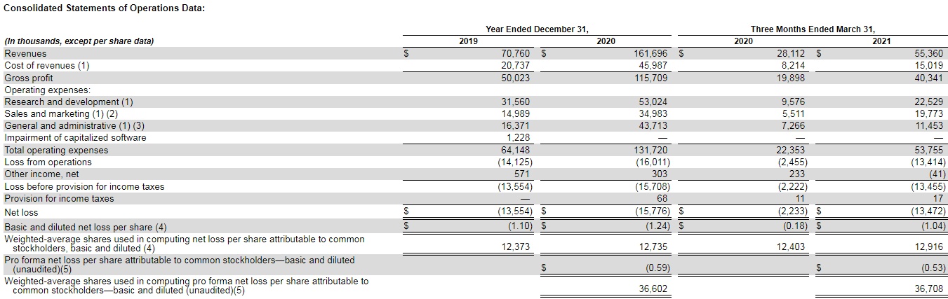 2020年营收为1.617亿美元,上年同期为7080万美元,同比增长129%。2021年Q1营收为5540万美元,上年同期为2810万美元,同比增长97%。