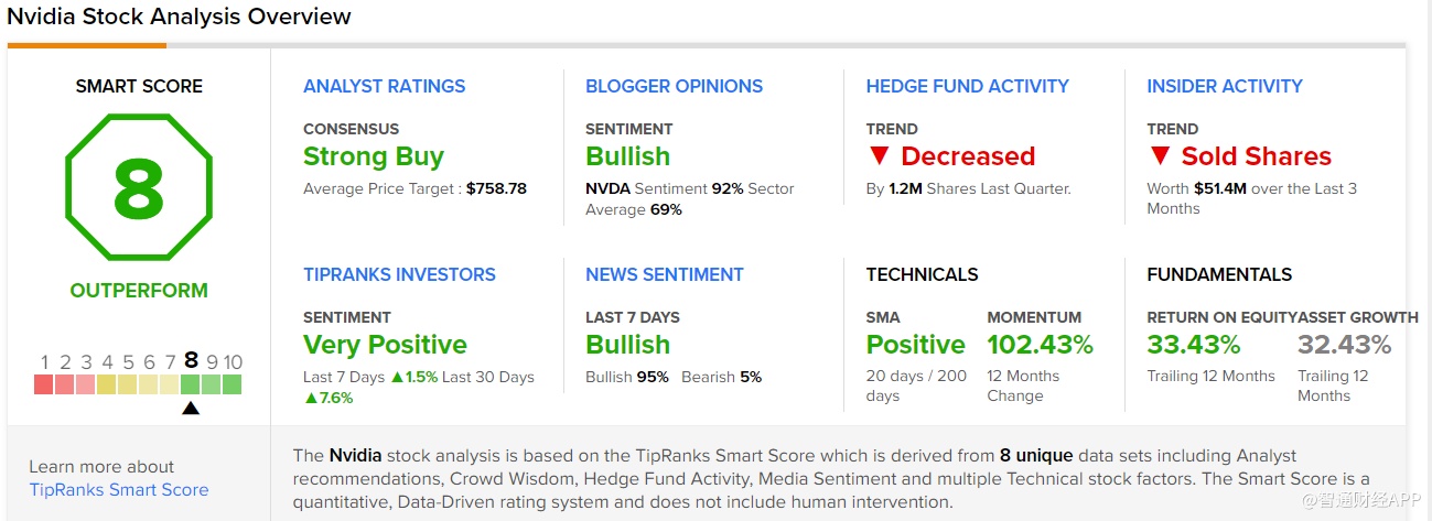 根据TipRanks的Smart Score评级系统,英伟达的得分为8分(满分10分),这意味该股的表现可能超过市场平均水平。