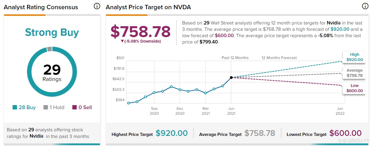 总体而言,华尔街有28位分析师予英伟达“买入”评级,1位予“持有”评级,共识评级为“强烈买入”,平均目标价为758.78美元。该公司的股价在过去一年上涨了107%。