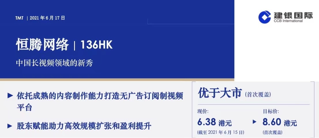 建银国际则发布研报首评恒腾网络,赞其为中国在线长视频市场新秀,看好因素来自四个方面:一是充分的高品质原创内容扩充计划;二是儒意丰富的高质量电影和电视剧制作经验;三是南瓜电影强劲的扩张势头;四是与恒大、腾讯两大股东生态的协同效应。