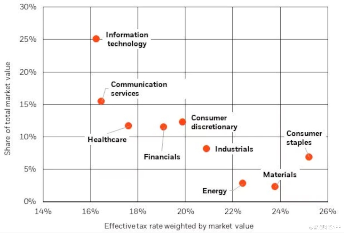 该报告研究了标准普尔500指数中每个板块的有效税率,并将有效税率与板块的市值进行比较。市值最大、有效税率最低的板块是信息技术板块,包括亚马逊(AMZN.US)和微软(MSFT.US)等公司。通信和医疗保健也是有效税率最低的行业之一。