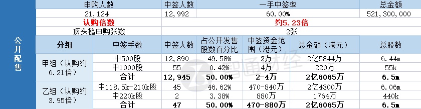 其中,公开配售申购人数21124人,一手中签率60%,认购倍数约5.23倍。