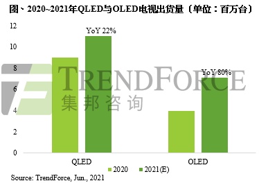 智通财经APP获悉,根据TrendForce集邦咨询调查显示,2021年电视品牌面临面板价格不断上涨,以及整机用的相关半导体零部件涨价和缺料的压力,导致品牌不得不缩减中小尺寸出货规模,转战获利丰厚的大尺寸和中高端产品,顺势推升今年中高端QLED电视出货量达1,102万台,年增22.4%;OLED电视出货量则达710万台,年增80%,两者皆创下新高。