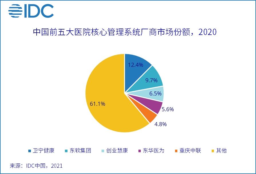 2020年除了传统的医疗信息化厂商参与竞争之外,也有很多新的厂商尤其是地域性的厂商加入到竞争中。IDC研究表明,2020年中国医院核心管理系统解决方案市场中前十名的厂商的市场份额为56.2%,相比上一年市场集中度略有下降。这主要是因为在中小城市的医院核心系统市场竞争中,一些地方性的小型厂商获得了更多的市场。2020年中国医院核心管理系统的主要厂商市场份额如下图所示。