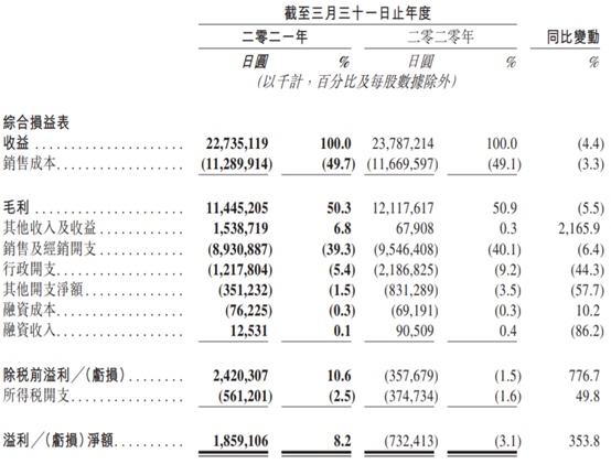 值得注意的是,公司在该财年内成功实现扭亏为盈,全年除税前溢利为24.2亿日元(相当于2220万美元),较上年有较为显著的提升。即便财年内受到疫情影响,HONMA仍然积极应对,把控上下游供应,将毛利率稳定在50.3%,净利润率大幅提升11.3个百分点达8.2%,盈利能力大幅提升。