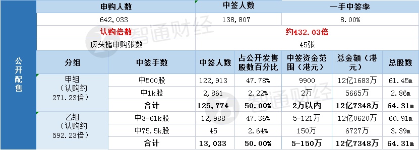 其中,公开配售申购人数642033人,一手中签率8%,认购倍数约432.03倍。