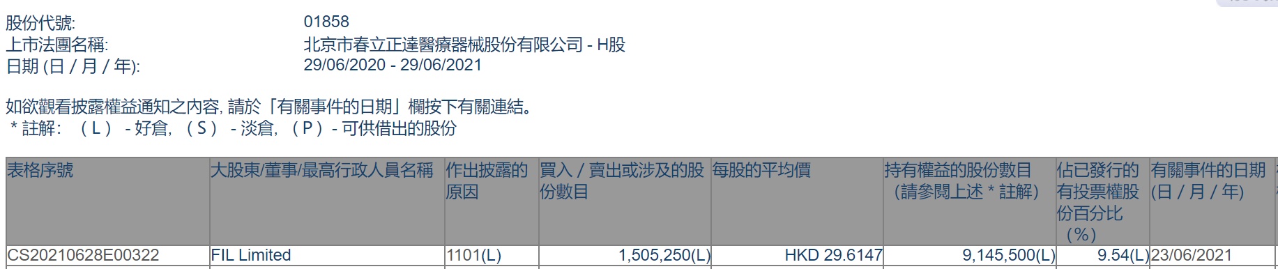 智通财经APP获悉,香港联交所最新资料显示,6月23日,FIL Limited增持春立医疗(01858)150.525万股,每股作价29.6147港元,总金额约为4457.75万港元。增持后最新持股数目约为914.55万股,最新持股比例为9.54%。