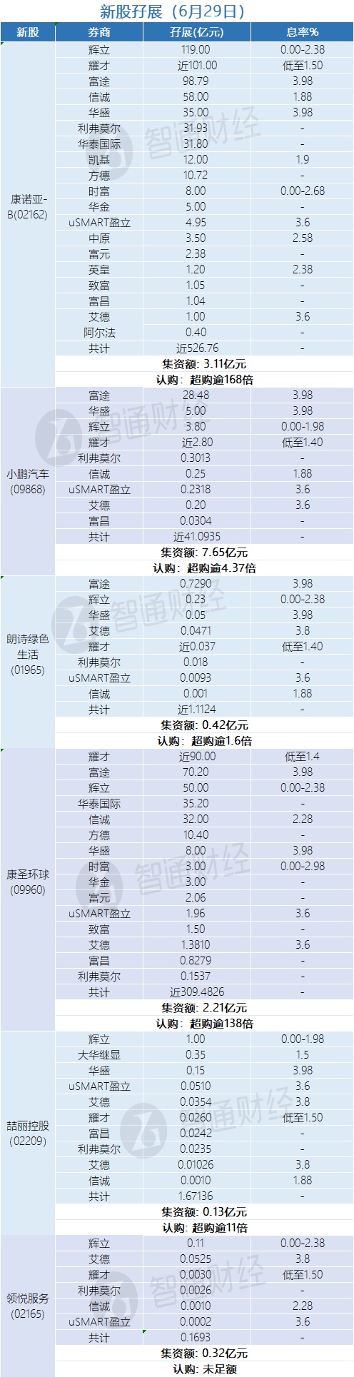 智通财经APP获悉,康诺亚-B(02162)、小鹏汽车-W(09868)、朗诗绿色生活(01965)、康圣环球(09960)、喆丽控股(02209)、领悦服务(02165)正在招股中。截至6月29日,富途、辉立、耀才等合计分别为其借出近526.76亿港元、近41.0935亿港元、近1.1124亿港元、近309.4826亿港元、1.67136亿港元、0.1693亿港元,其中,康诺亚-B超购逾168倍,小鹏汽车-W超购逾4.37倍,朗诗绿色生活超购逾1.6倍,康圣环球超购逾138倍,喆丽控股超购逾11倍。