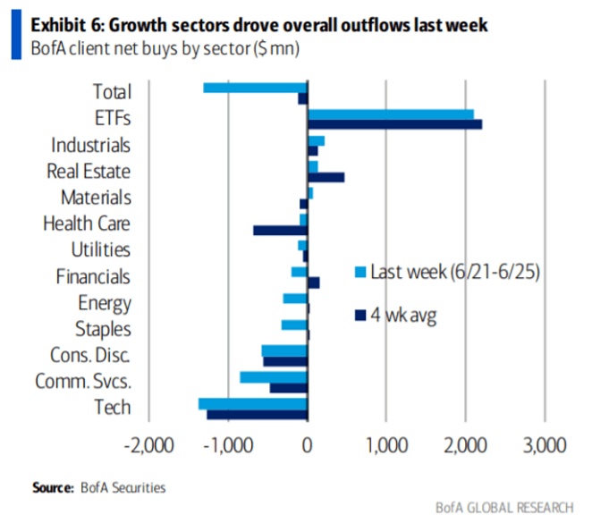 智通财经APP获悉,上周,标普500指数上涨2.7%,创下2月份以来的最大单周涨幅。周一(6月28日),道指下行,标普500指数及纳指再创新高。但美国银行证券的客户抓住机会逢高出货,继续从高价值成长型行业撤资。